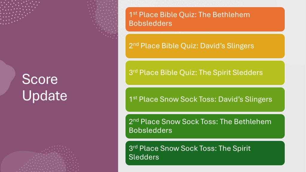 Soul Cafe Kids, Preteens & Youth February 5, 2026 Here are the scores for the first day!!!! Good Job, Kids!!!! Share this: Share on X (Opens in new window) X Share on Facebook (Opens in new window) Facebook Email a link to a friend (Opens in new window) Email Print (Opens in new window) Print Like Loading... Related